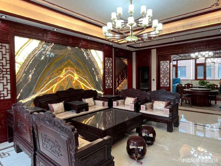 客厅以红木雕花沙发与茶几为主体,靠垫绣有精致纹样;背景墙为金色山水纹理大理石,两侧搭配镂空雕花屏风,顶部悬挂多灯头水晶吊灯。地面铺设浅色大理石地砖,右侧可见木质餐桌与博古架,楼梯扶手亦有传统纹样装饰,整体布局对称和谐,尽显中式美学韵味。