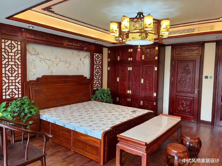 深色红木大床线条沉稳,床头靠背雕刻传统纹样,床尾设抽屉储物;同材质衣柜门板饰浮雕花纹,柜顶嵌灯带。床头背景墙绘水墨牡丹与书法文字,浅色底墙搭配深色实木线条勾勒边框。床面铺蓝白花纹绸缎床品,两侧各置一盆绿植。顶部悬挂中式宫灯造型吊灯,暖黄色灯光透过彩色玻璃罩洒落,与红木家具色泽相映,营造古典雅致的休憩空间。