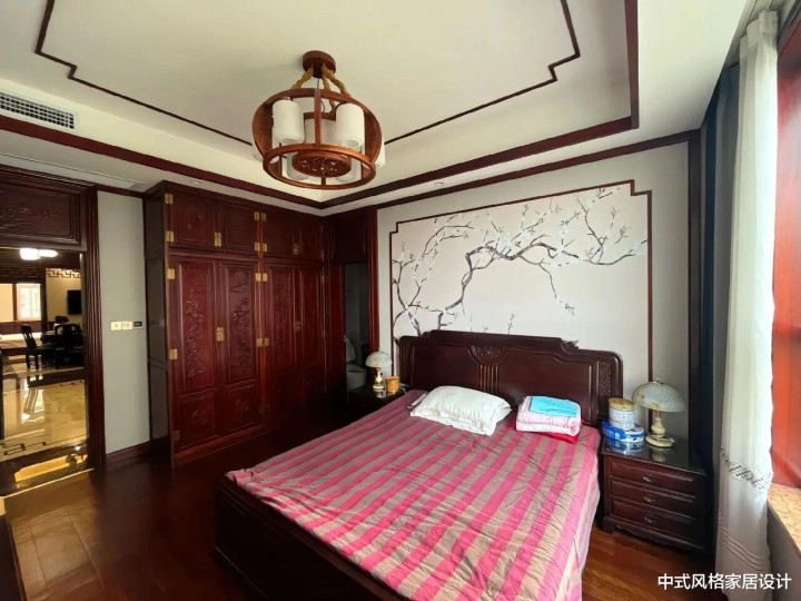 中式风格卧室,整体雅致温润。以深棕色实木家具为主,包括雕花床头、对称床头柜及嵌入式衣柜,线条沉稳;墙面为米白色,搭配木质线条吊顶,色调和谐统一。床头墙面悬挂水墨梅花图,枝干舒展,尽显东方雅韵;床头柜上摆放铜制台灯与陶瓷罐,细节处凸显中式精致。床品为粉白格纹,增添柔和气息,整体营造出古朴与现代交融的静谧氛围。