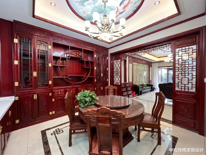 餐厅整体典雅庄重。中央为圆形红木餐桌,搭配同色系餐椅,椅背雕花精致;餐桌中央摆放青绿盆栽,增添生机。墙面以深红色实木柜体为主,柜门嵌玻璃,柜内陈列雅致器物,柜顶圆形装饰画与顶部圆形吊顶相呼应。吊顶悬挂古典水晶吊灯,暖光映照下,红木纹理与地面黑白相间地砖形成鲜明对比。空间通过镂空雕花隔断与客厅相连,既分隔区域又保持通透,尽显中式古典美学韵味。